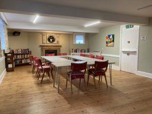 There are large tables set out and comfortable padded chairs. It has a small kitchen and facilities for making and serving teas and coffees.