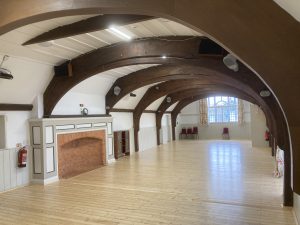 Unusually the beamed and characterful main hall is on the first floor which is accessed by an external flight of stairs. It has a well equipped kitchen and facilities. Comfortable chairs and trestle tables are available for use.